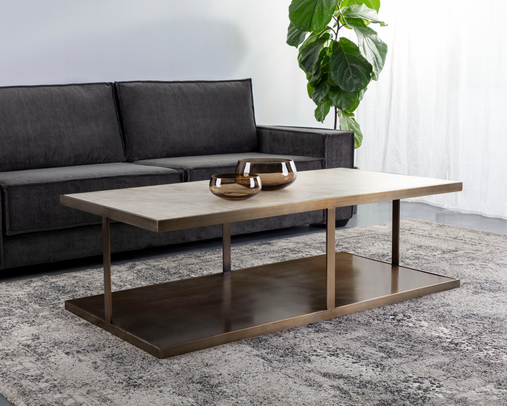 Warm tones and sleek modern lines define the Kamali Coffee Table. The beige rectangular marble tabletop is beautifully outlined by an antique gold powder coated stainless steel base. It's the perfect addition to any living space. Side table version also available. As marble is a natural material, unique veining, pitting, fissures, micro-cracks and colour variations are all characteristics that add to the uniqueness and beauty of each piece.