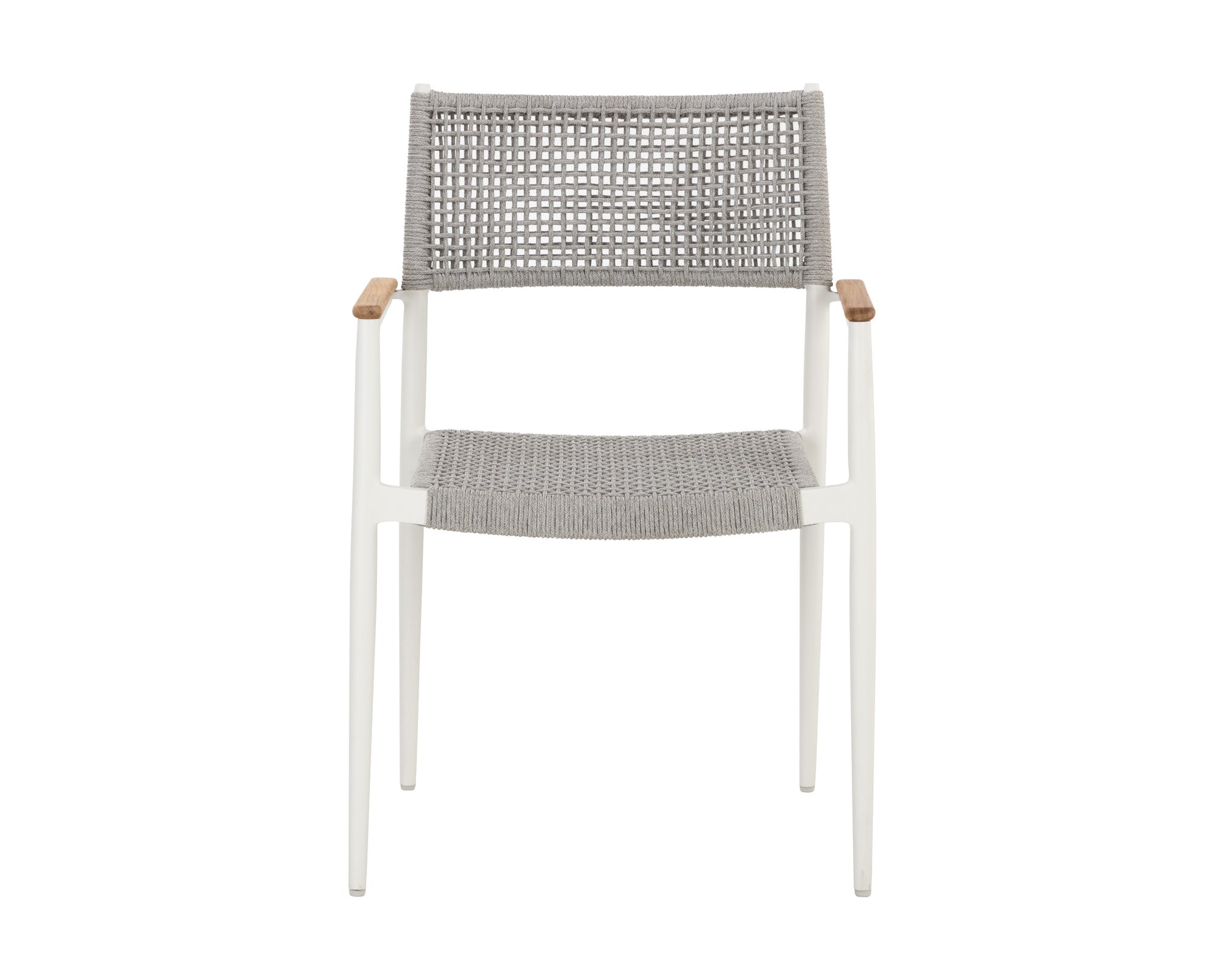 The Nava Stackable Dining Armchair boasts a light and airy design that will resonate in any space. Features solid teak wood detailing on the armrests paired with a white powder-coated aluminum frame. Completed with a greymix rope weave on the seat and backrest. Suitable for indoor and covered outdoor spaces.