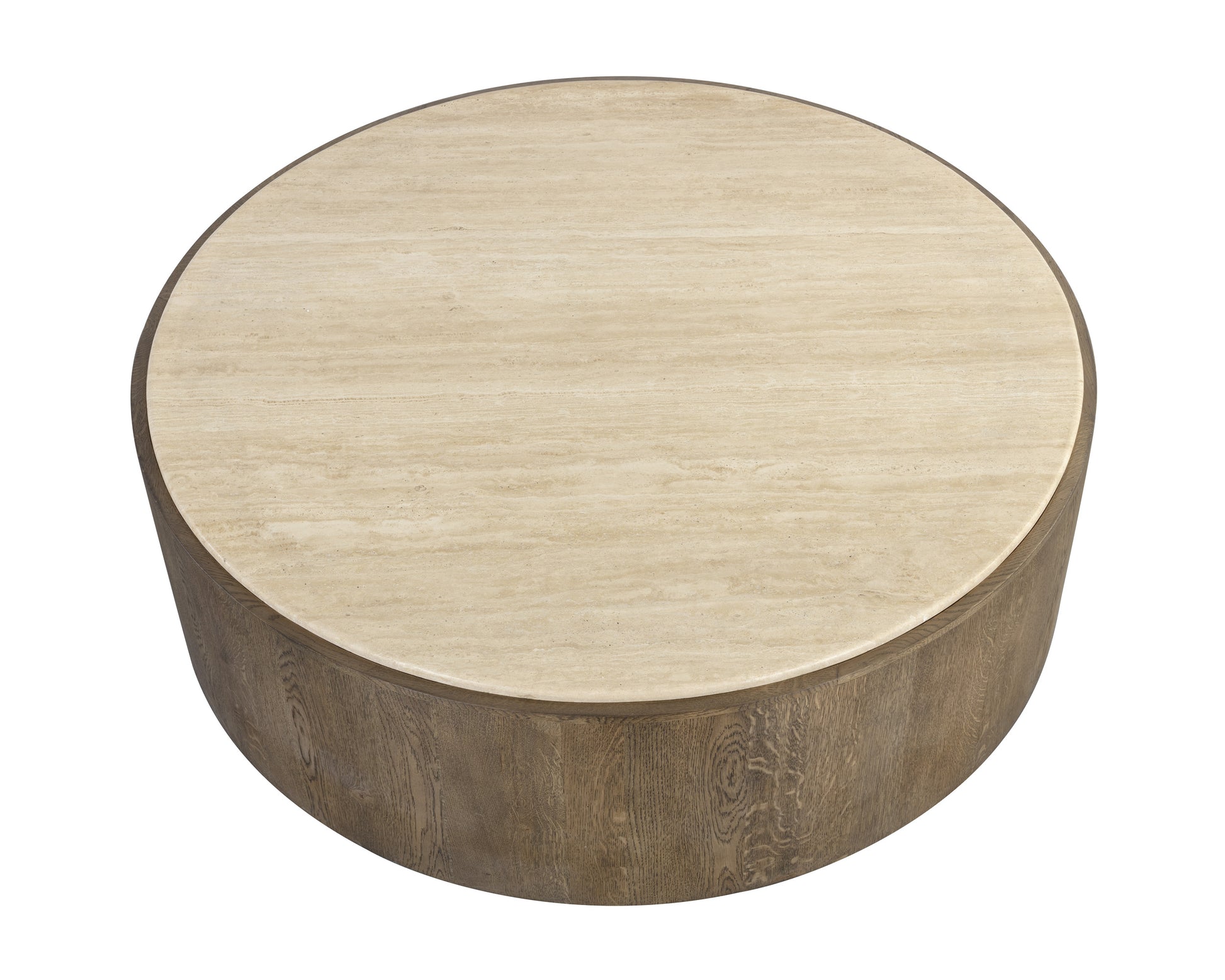 The simple round silhouette of the Oberon Coffee Table accentuates the inherent beauty of natural mixed materials for a versatile piece that will enhance any room. Handcrafted and finished by skilled artisans, this piece includes a solid travertine top and an oak veneer base with a solid oak wood edge. As travertine is a natural material, unique veining, pitting, fissures, micro-cracks and colour variations are all characteristics that add to the uniqueness and beauty of each piece. As wood is an organic, porous material, these pieces will contain natural variation of texture and may also exhibit fine indentations and cracks. Wood pieces will also display a disparity of colour and grain, and visible knots and burls that add to the character of each piece. Made in India. With refined craftsmanship, this design was brought to life by skilled local artisans. Due to the nature of handcraftsmanship, unique imperfections such as fissures, markings and variations in colour and shape are welcomed and appreciated characteristics for a truly one-of-a-kind piece.