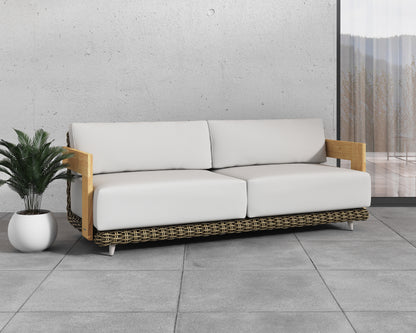 Escape to an outdoor oasis with this beautiful Outdoor by SUNPAN sofa crafted with a unique set of mixed materials. Features deep, thick seat in palazzo cream fabric with sleek, solid teak wood armrests. A taupe wicker exterior complete this intricate design. Suitable for indoor and covered outdoor spaces.