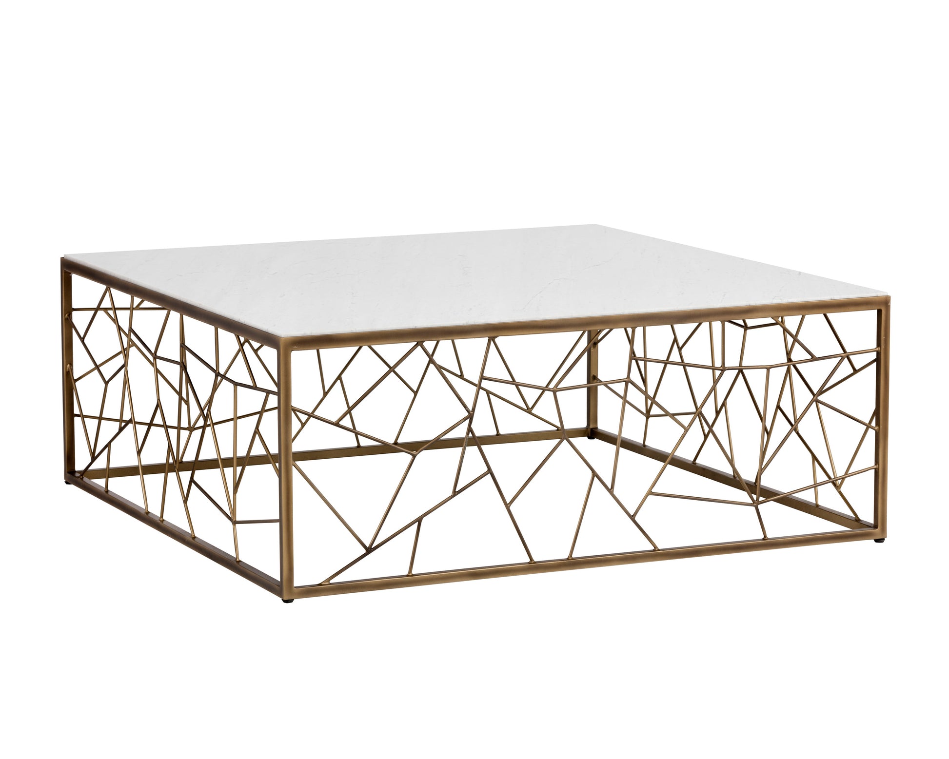 This large and dramatic coffee table is sure to be the center of attention in any room. A white Volakas marble top is beautifully paired with a powdere-coated rustic bronze steel frame in an intriguing webbed pattern. Suitable for lounge and living spaces in residential and commercial environments. As marble is a natural material, unique veining, pitting, fissures, micro-cracks and colour variations are all characteristics that add to the uniqueness and beauty of each piece.