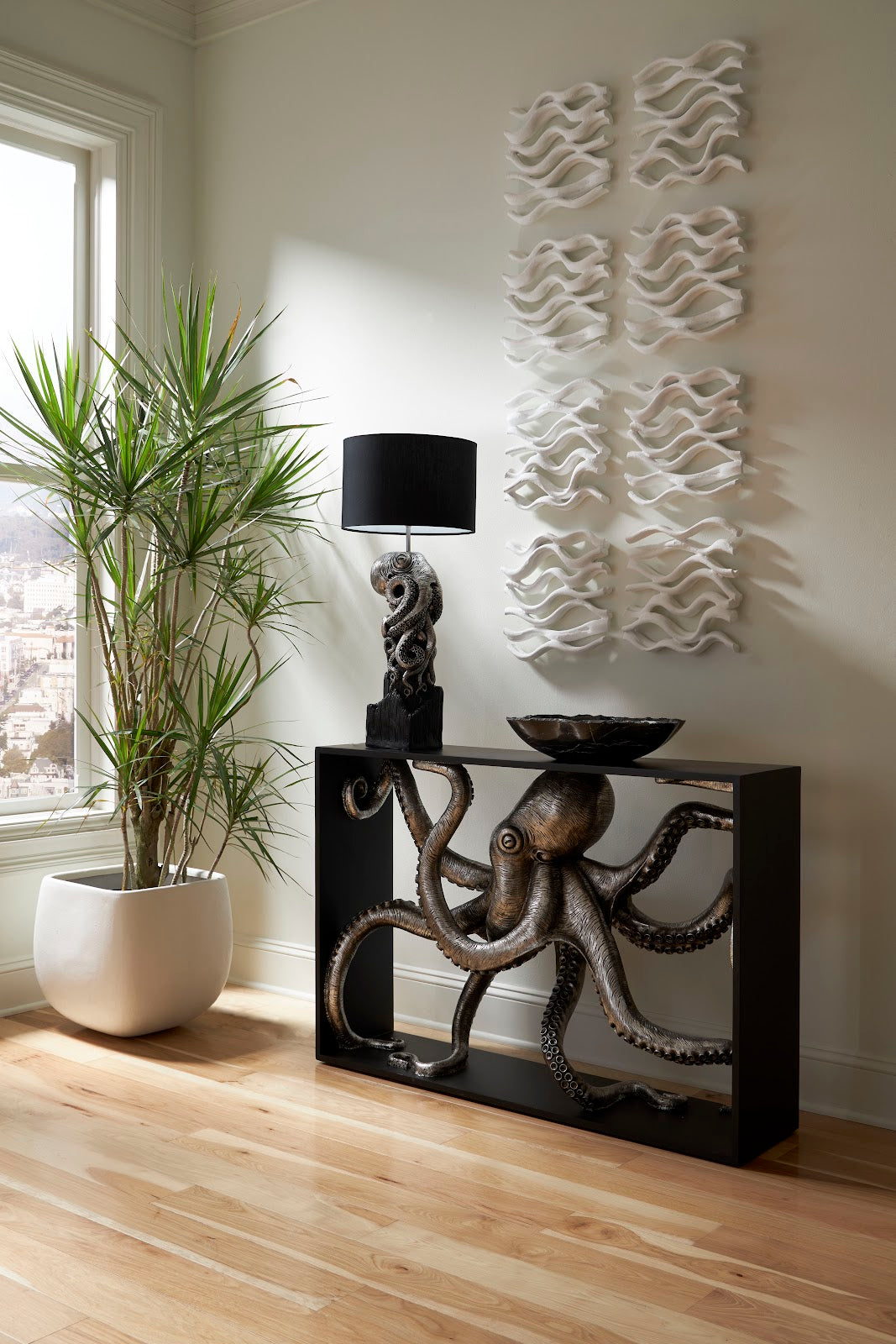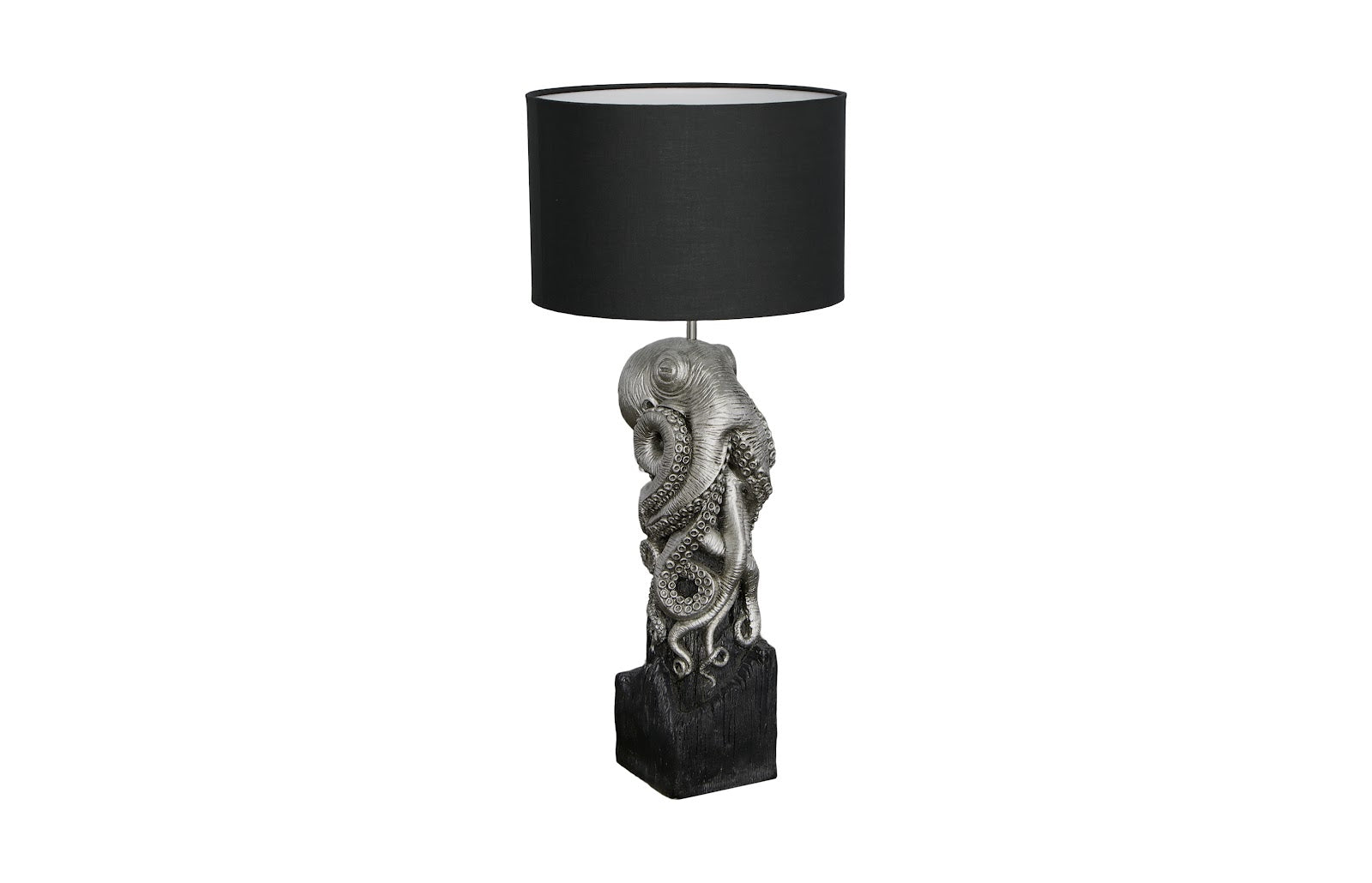 Our Octopus Table Lamp has a sleek and intelligent design, much like the octopus itself. Artisans have sculpted it as if it is swimming up current on the table lamp base. The silver leaf finish creates dramatic shadows and highlights, making this mollusk more mysterious than ever. Movement is captured in the composition of the octopus, seeming as though it may start crawling out toward you at any moment.
