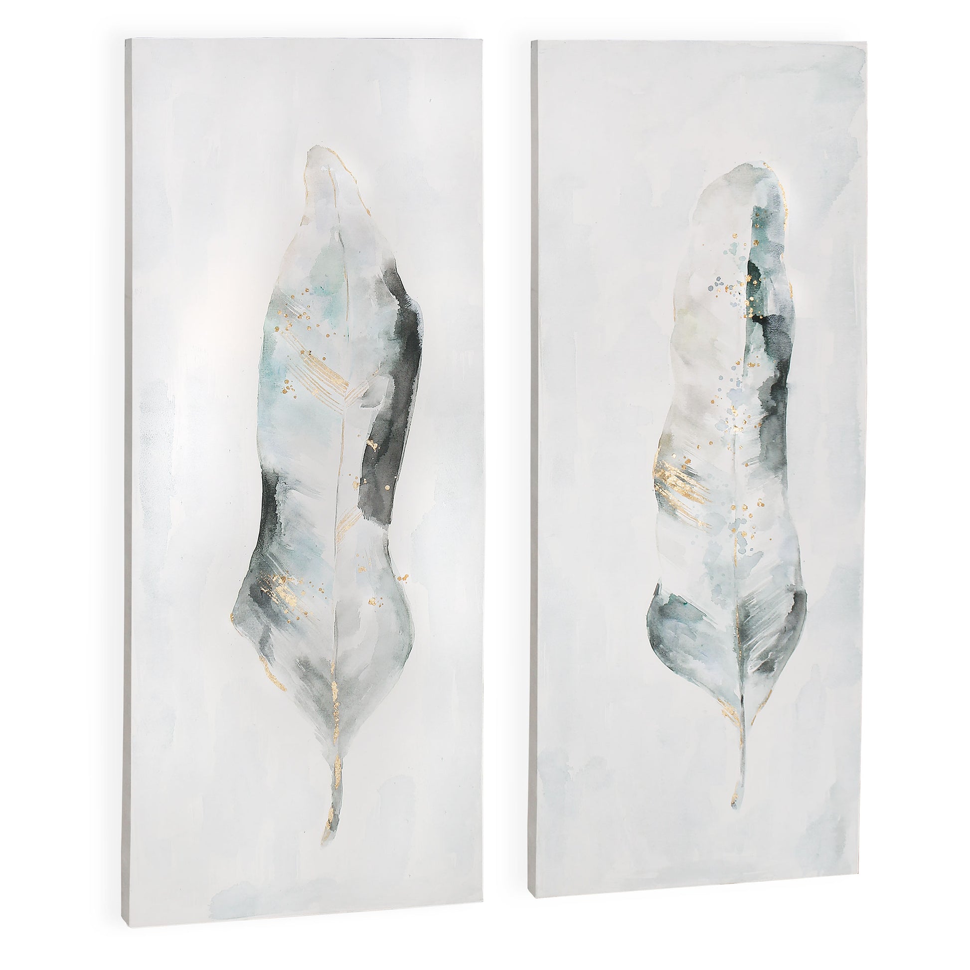 Bring the cool serenity of nature into your home with this set of two feathers in pastel colour pallet. Each piece is hand painted and framed with a silver floater frame.