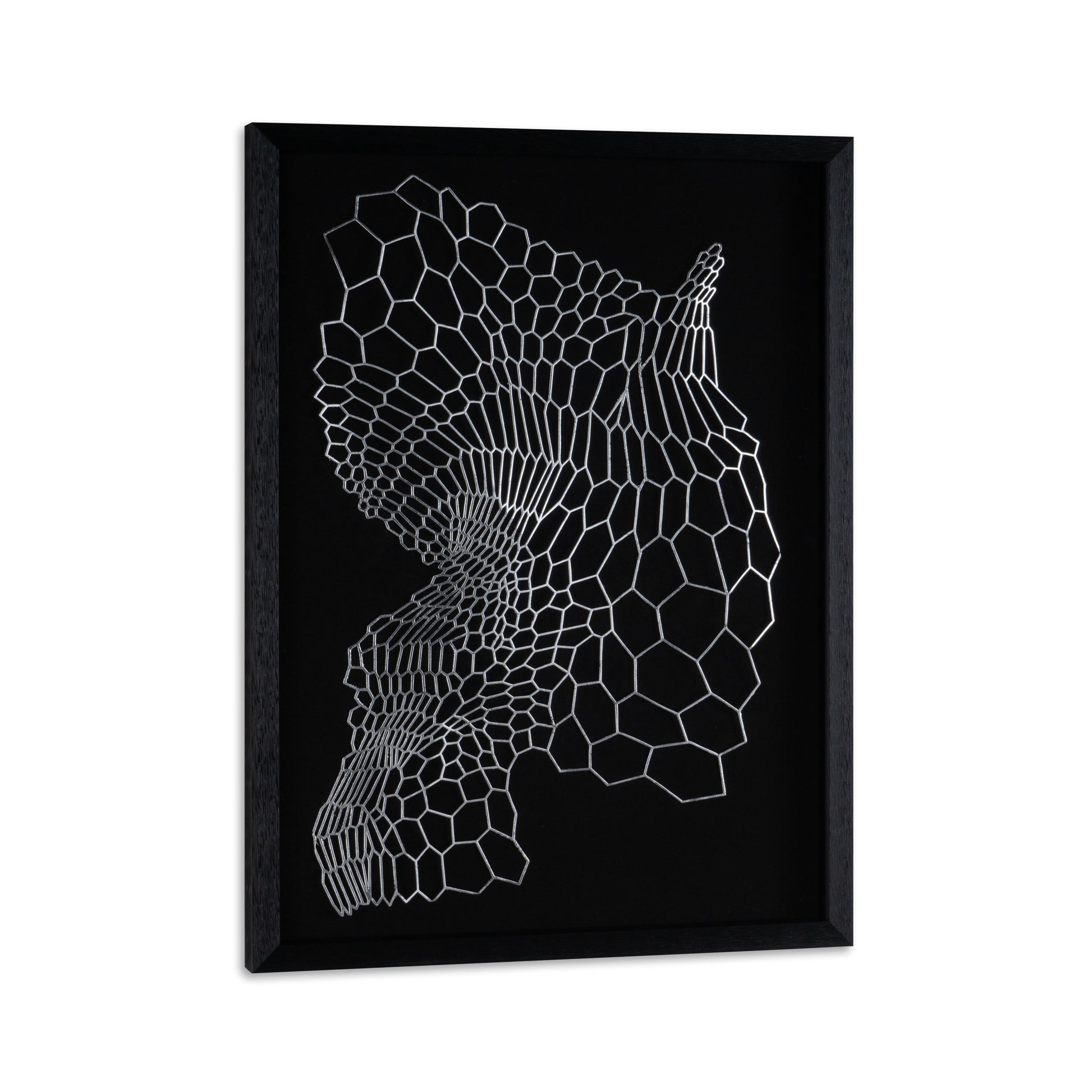 Step into the realm of elegance with this striking shadow box. A deep black background and frame provide the perfect stage for the silver iron cutout, which captivates with its intricate detailing and a fascinating wavy, three-dimensional appearance. Encased in glass, this 24" x 32" composition is an ode to the interplay of light and shadow, making it an artful centerpiece for any space. Sold separately, its pairing counterpart promises a symphony of shadow and light, offering endless possibilities for curated displays