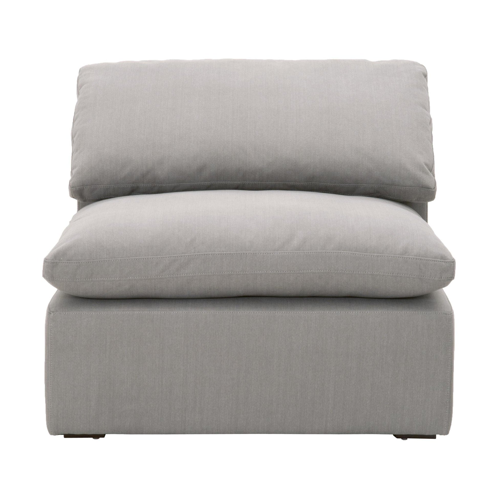 Add transitional style to your living room, family room, or den with the Sky Modular Armless Chair . Made with micro boucle fabric, the latte-colored upholstery is easy to clean with its high performance and quality design. With the seat cushion made of half down and half polyester, this chair is extremely comfortable to curl up and read a book or watch television on. It features reversible seat and back cushions, as well as ties to prevent the cushions from moving. Constructed with 3.8" coil sinuous springs and stain resistant fabric, this chair is meant for durability and dependability. The exposed birch wood feet have an espresso finish. It measures 39.5 inches wide, 40 inches deep, and 36 inches high, with a seat height of 21.5 inches. Pairs nicely with other Sky Modular Sofa pieces or works on its own as additional seating.