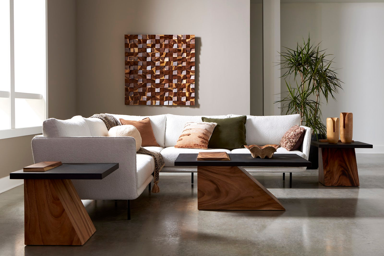 The dynamic profile of the Slant Coffee Table makes it both a utilitarian object and a statement piece. Featuring an angular wood base in an opposing slant creates an interesting tension. The sleek black top contrasts the lovely warmth of the natural wood to make a statement. Clean lines of this contemporary wood coffee table make it perfect for modern interiors, and the use of reclaimed wood illustrates our deep appreciation for melding nature and design.