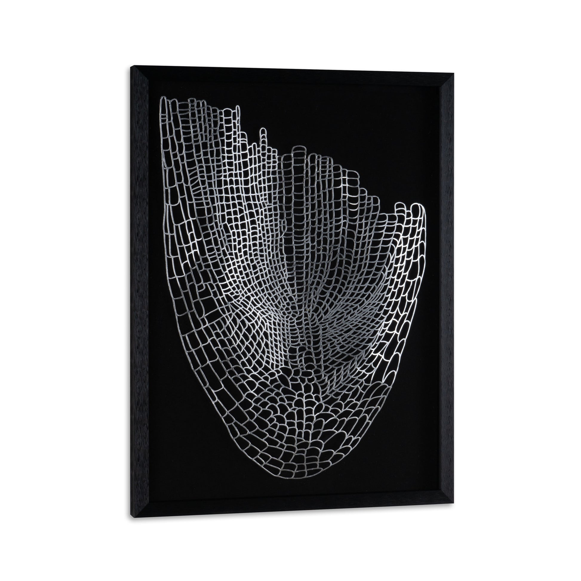 Step into the realm of elegance with this striking shadow box. A deep black background and frame provide the perfect stage for the silver iron cutout, which captivates with its intricate detailing and a fascinating wavy, three-dimensional appearance. Encased in glass, this 24" x 32" composition is an ode to the interplay of light and shadow, making it an artful centerpiece for any space. Sold separately, its pairing counterpart promises a symphony of shadow and light, offering endless possibilities for curated displays
