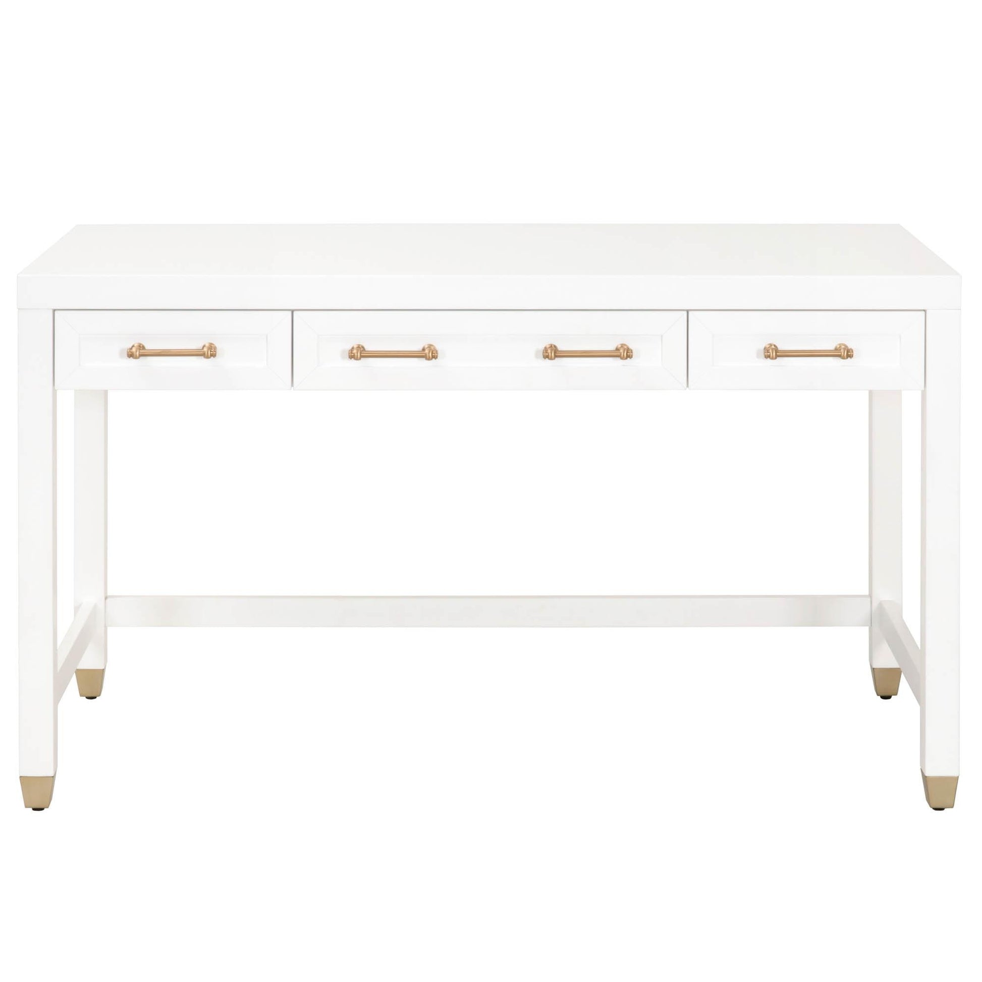 Elevate your home office or bedroom with the Stella Desk . This chic desk is an ideal working space with transitional style. It showcases a light honey finish accented with brushed brass handles and feet, effortlessly adding a touch of elegance to any room. Constructed from solid oak wood and oak veneer, with steel hardware, this desk is designed to provide long-lasting durability. Measuring 54" wide, 27.5" deep, and 31.5" high, it offers ample space for all your work essentials, and the finished backside allows for versatile placement within your room. The three storage drawers are equipped with full-extension metal glides, allowing for easy access to your supplies, and the hold-in detent prevents drawer roll-out for secure and stable use. Enhance your productivity and interior style with this exquisite and practical desk.