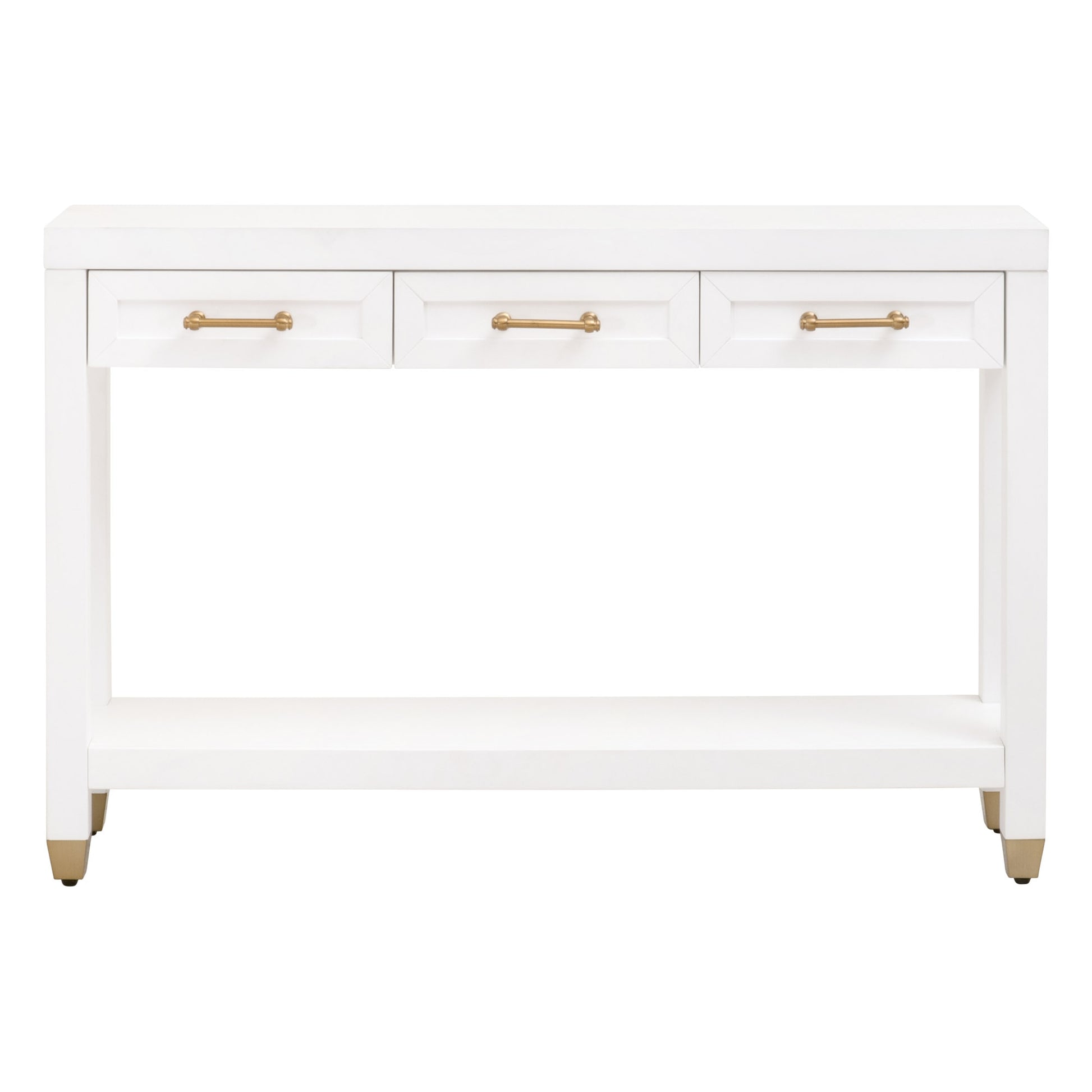 This simple but classy Stella Console Table will be a perfect fit in just about any living space. It measures 47.25 inches wide, 11 inches deep, and 31.5 inches high. Finished in light honey oak and brushed brass accents, it will complement many color schemes and decorative styles. It conveniently features three storage drawers and a bottom shelf for additional storage or decor display. Its narrow frame helps make this table an ideal fit for smaller spaces as well. This table will make a great addition functioning as a sofa table, entryway table, or accent table.