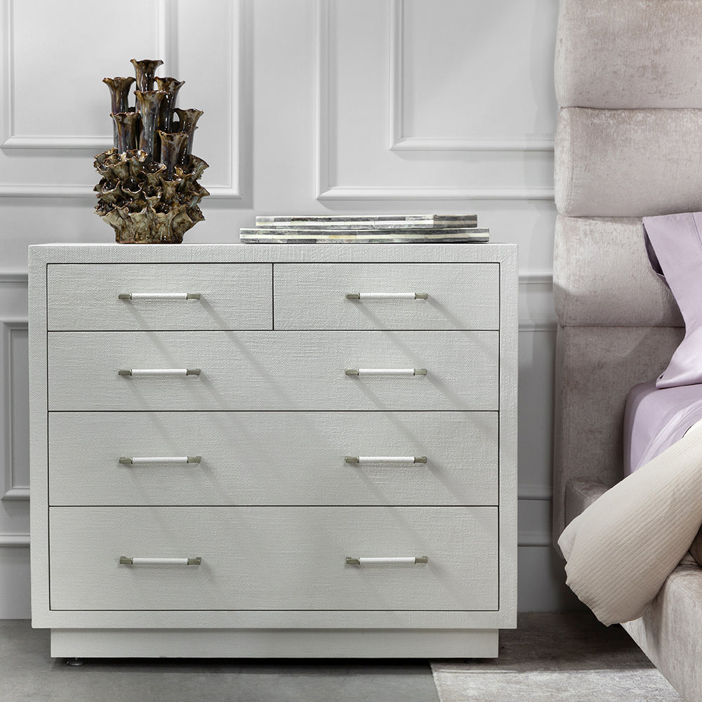 Discover timeless storage sophistication with the Taylor 5 Drawer Chest. This refined piece showcases a clean white faux linen finish paired with champagne silver accents, creating an understated yet elegant aesthetic. The five generously proportioned drawers offer substantial capacity for your wardrobe essentials and household items, all while maintaining a sleek profile that seamlessly integrates into any interior design scheme.
