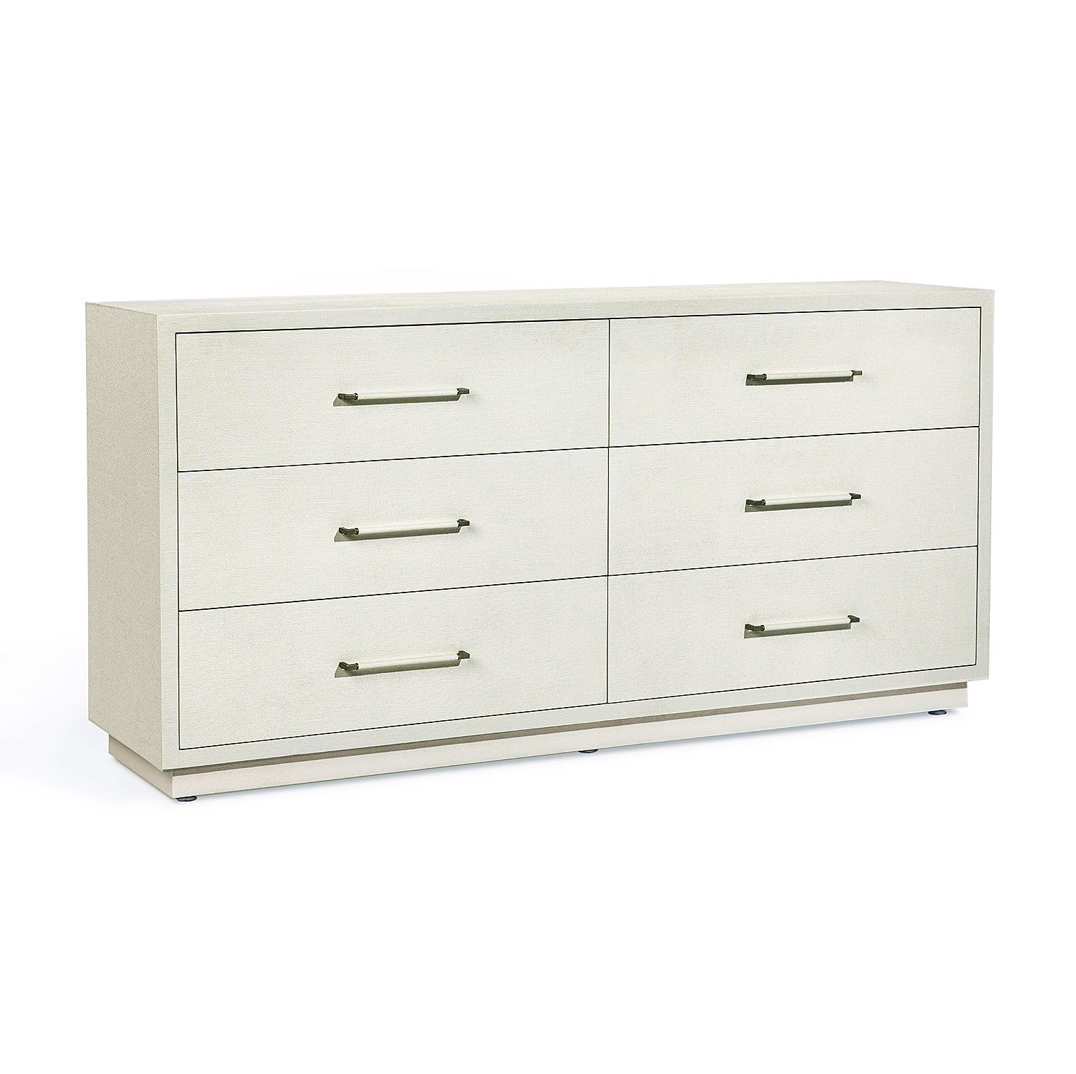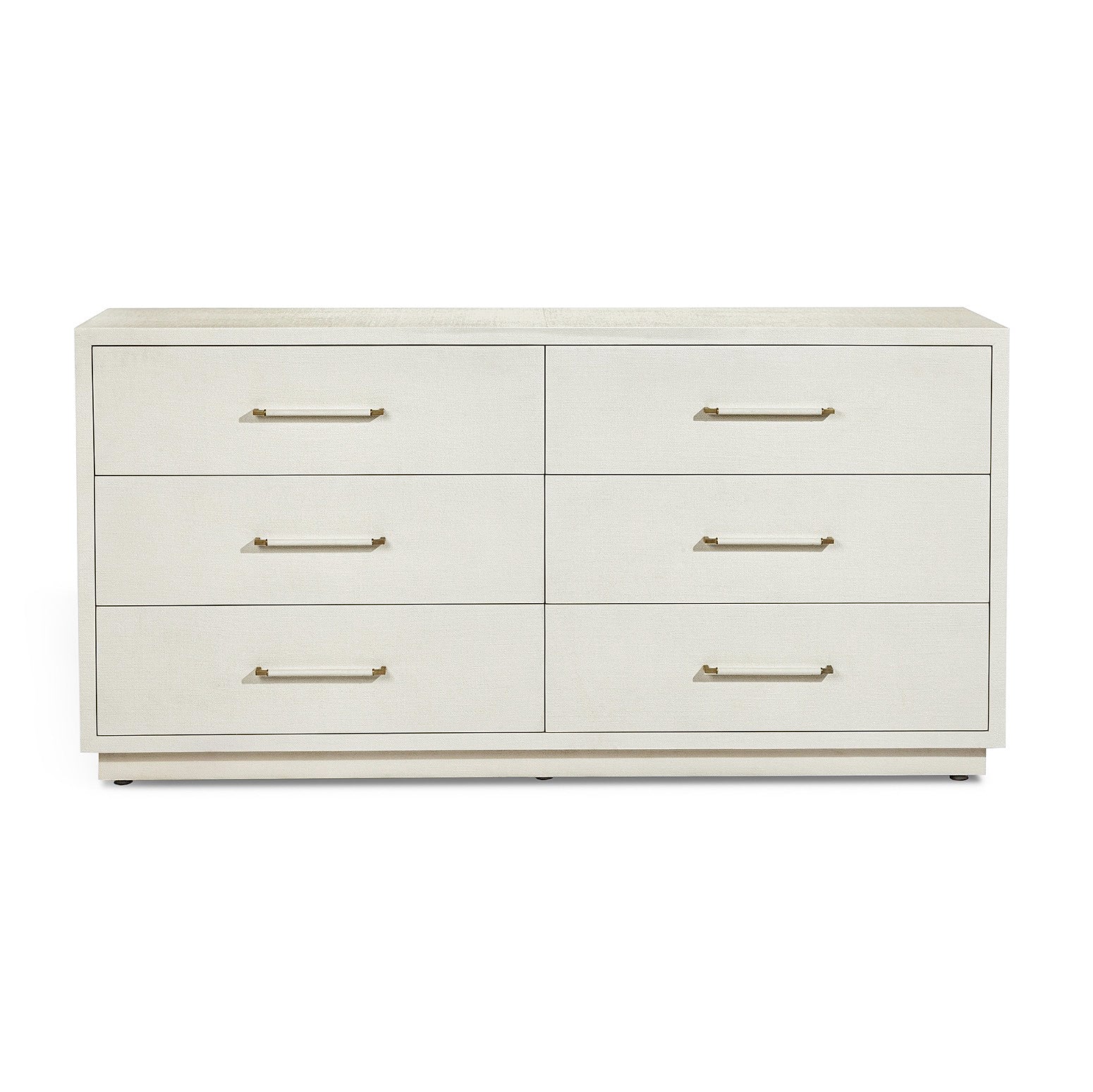 Elevate your bedroom with the Taylor 6-Drawer Chest, where minimalist design meets refined elegance. Featuring a pristine white faux linen finish and champagne silver hardware, this piece combines understated sophistication with practical storage. Six spacious drawers provide ample room for linens, clothing, and accessories while maintaining a streamlined silhouette that complements any décor style.