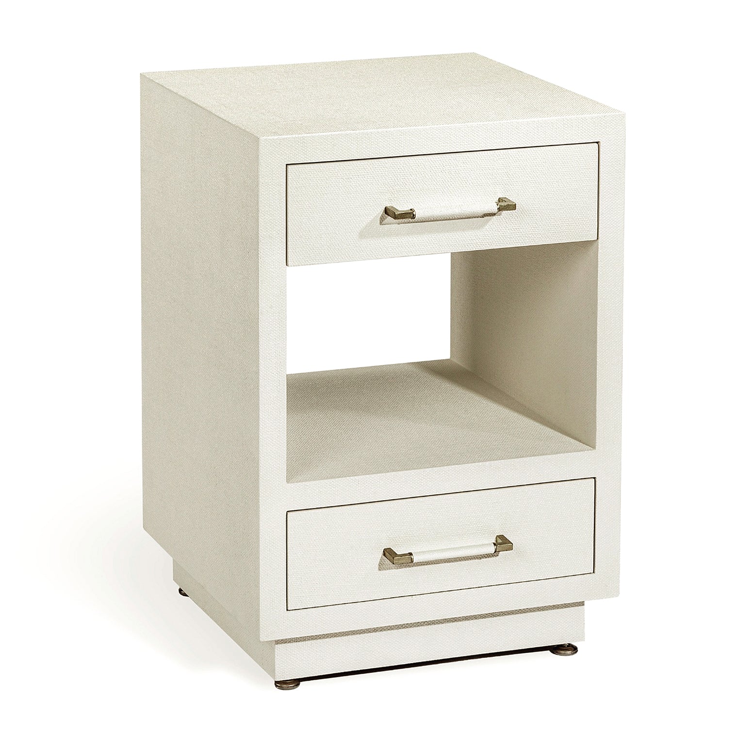 The clean lines of the Taylor Small Bedside Chest are transformed into a statement piece thanks to a surface of natural white faux linen and metal pulls in champagne silver.