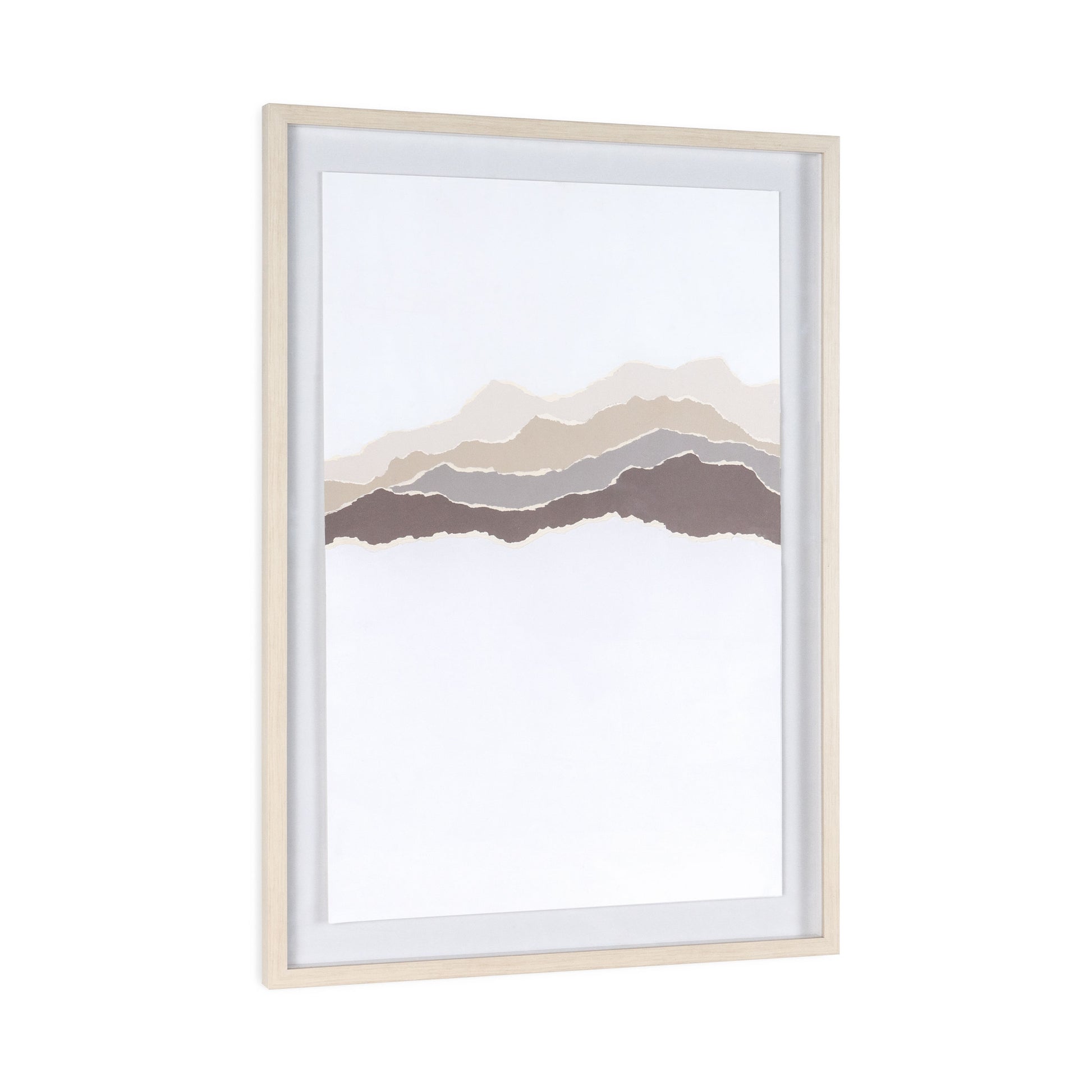 Step into a realm of visual poetry with this striking shadow box artwork, measuring 26" x 2" x 37". A symphony of earthy neutrals dances across torn paper, coalescing into an abstract mountain panorama that stirs the imagination. Encased in a polycomposite frame with the subtle warmth of light-colored wood, protected by sleek plexiglass, each piece is a testament to modern sophistication. While sold separately, they harmonize effortlessly when paired, creating a unified statement that elevates any space with contemporary allure