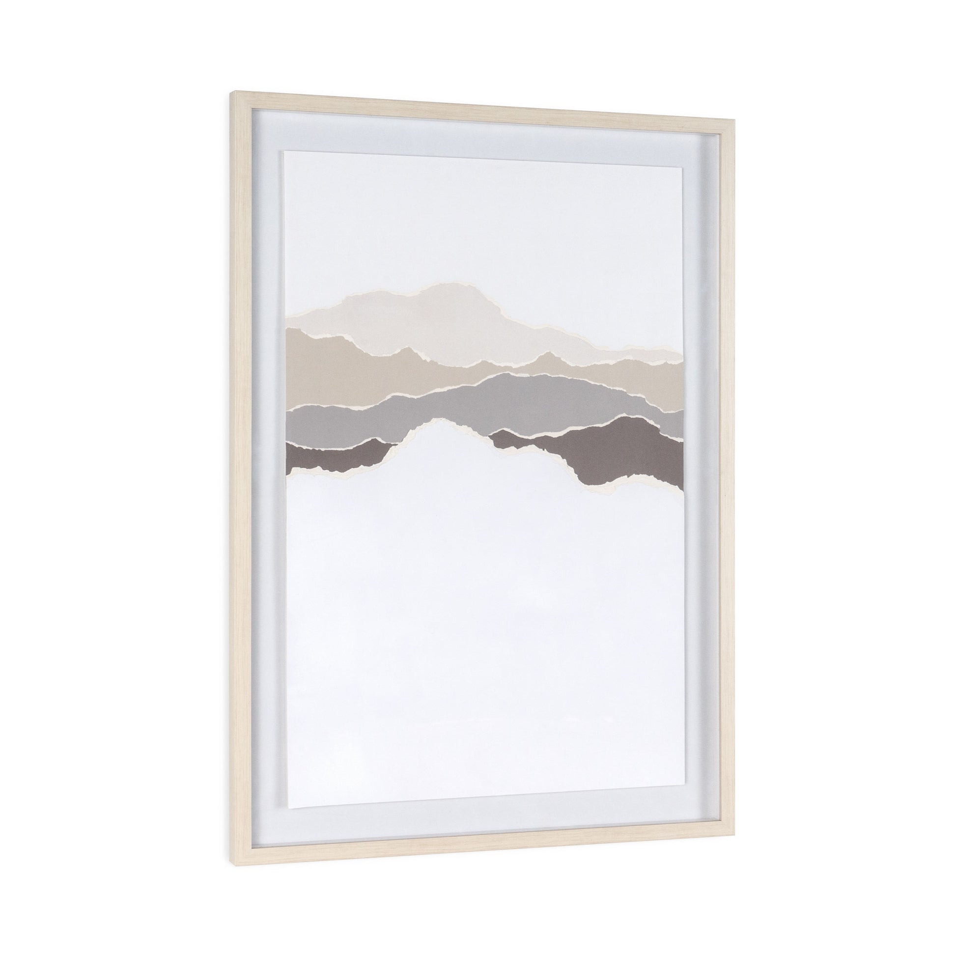 Step into a realm of visual poetry with this striking shadow box artwork, measuring 26" x 2" x 37". A symphony of earthy neutrals dances across torn paper, coalescing into an abstract mountain panorama that stirs the imagination. Encased in a polycomposite frame with the subtle warmth of light-colored wood, protected by sleek plexiglass, each piece is a testament to modern sophistication. While sold separately, they harmonize effortlessly when paired, creating a unified statement that elevates any space with contemporary allure
